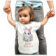 Desenho adorável de um coelho branco com grandes olhos azuis segurando um ovo azul de Páscoa. O nome Jennifer está escrito em uma bela fonte de cor de coral pastel e deve ser mudado para a criança que a camisa serve. Sob o nome, encontra-se a mensagem "A minha Páscoa das 11 ruas", que pode ser alterada para qualquer ano adequado. É também da mesma cor que o outro texto. Essa camiseta está disponível em outros tamanhos, de 6 meses a 24. Você também pode mudar a cor da camisa, mas certifique-se de escolher entre o processo de impressão "Impressão vívida, Subbase Branca" ou as cores da ilustração não permanecerão seguras.