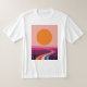The image is an abstract vector illustration in a retro-futuristic style. The illustration features a large orange sun against a bright pink sky. There is a colorful, rainbow-colored winding road leading the eye to the horizon. The hilly landscape features deep purple and pink colors. The design uses clean shapes and lines to create an optical experience.