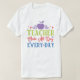 Este design apresenta uma camiseta branca com a palavra "PROFESSOR" em verde, acima de "Modo todo o dia" em um script vermelho estilizado e "TODO DIA" em letras de blocos azuis. O design inclui um gráfico de maçã roxa no topo.