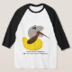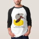 Um pato de borracha amarela com uma cabeça T-Rex, e um leme e um leme de veleiro na boca, diz, "Envie mais campistas. Os últimos estavam deliciosos."