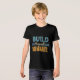 O design de t-shirt contém a frase "Construir além dos limites", que aparece de forma destacada na tipografia ousada e moderna. As palavras são colocadas sobre um fundo dinâmico, abstrato que sugere movimento e potencial ilimitado. O design geral transmite um sentido de ambição, inovação e o poder de superar obstáculos.
