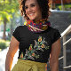 Motivos florais brancos amarelos que correm diagonalmente nesta camiseta escura. Arte folclórica do Sul da Hungria - chama-se Kalocsai. Bonito flores de colheita contra base escura. Excelente para amantes da moda étnica.