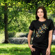 Motivos florais brancos amarelos que correm diagonalmente nesta camiseta escura de Tri-Blend. Arte folclórica do Sul da Hungria - chama-se Kalocsai. Bonito flores de colheita contra base escura. Excelente para amantes da moda étnica.