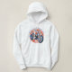 O capuz branco da mulher com moto circular vermelha e azul e design de flores na frente. O texto diz "Nascer de atravessar o vento."