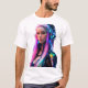 Uma mulher mesmerante de 20 anos com beleza futurista está confiante. Ela está encapsulada em um traje cibernético, movendo-se com fluidez e precisão. Seu sabre cibernético aumenta sua presença poderosa. Seu cabelo fluindo se assemelha a riachos de luzes neonatais, lançando um brilho vibrante que adiciona um toque de brilhantismo ciberpunk à sua aparência. Cada fio de cabelo é trabalhado meticulosamente com padrões holográficos que brilham e mudam, criando uma tela de cores sempre em constante mudança.