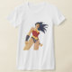 Mulher Maravilha de pé com os punhos ao seu lado. Ao fundo você pode ver os prédios de cidade alta e arranha-céus, contra uma explosão de sol retrógrada e o nome da Mulher Maravilha no céu.