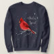 Das mulheres cardinais vermelhas do espírito inverno" do pássaro da época natalícia do Natal do tempo de inverno a camisola nevado do "que caracteriza um pássaro cardinal vermelho selvagem bonito empoleirou-se em cima dos ramos de árvore cobertos de neve bonitos das naturezas com os flocos de neve brancos do inverno que caem no ar. Feriado #Ideal do Natal, estação do inverno, as camisolas das mulheres.