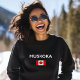 Mostra a bandeira vermelha e branca canadense com folha de bordo e a cidade "Muskoka" acima da bandeira. Aproveite o recreio exclusivo e rico de Ontário. Para as pessoas que possuem uma cabana em Muskoka e/ou no lago Muskoka, para os Ontarianos, Canadianos, turistas americanos, visitantes. Para pessoas que gostam da natureza, esportes aquáticos, canoagem, caiaque, remar, embarque, barco, navegação ou barco.