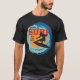 Silhueta dinâmica de surfe com um design de pôr do sol do oceano ao estilo do grunge.