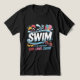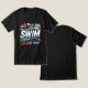 Uma camiseta preta com um design vibrante com a palavra "NATAÇÃO" em letras brancas, cercada por ícones coloridos como óculos e uma piscina flutuante. As frases "ISTO ESTÁ NO SEU SANGUE!" e "NATAÇÃO DO AMOR VIVO!" em vermelho acrescentam um toque energético, perfeito para nadadores que vivem e respiram o esporte.