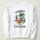 Engraçado design de Natal com uma ilustração de Papai Noel relaxando na praia sob uma palmeira em uma pequena ilha. Um jogo perfeito para o Natal em julho, assim como para o Natal real em dezembro.