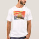 Navio de vela com vela despojada, navegando em água salgada e azul-oceânica com céu laranja brilhante no fundo