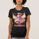 "Para uma design minimalista, mas elegante, um belo anjo é representado em um sutil contorno branco em uma camiseta preta. As asas do anjo são translúcidas com um leve brilho, liberando um olhar vintage e sonhador. O anjo está numa pose relaxada com as mãos ligeiramente levantadas, como se flutuasse no vento. Seu longo cabelo ondulado parece estar soprando na brisa clara, e sua expressão é calma e pacífica, que parece casual e na moda." O destaque da design é dar um toque de conto de fadas com elegância e simplicidade.