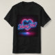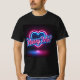 Esta camiseta masculina do Casado Me? apresenta um design de sinal de neon em azul elétrico e rosa com um contorno de coração brilhante sobre um fundo preto puro. Perfeito para propostas e amantes modernos.