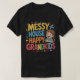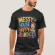 Este design apresenta uma camiseta preta com as palavras "MESSY HOUSE" empilhada sobre "HAPPY NETOS". As letras estão em um estilo de desenho colorido. A design inclui também um desenho animado de uma criança sorridente segurando um avião de brinquedo.