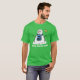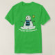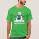 Snowman de Natal numa camiseta. A mensagem diz "Feliz Natal!" (mas você pode mudar isso). Camisa verde. Camisa de Natal.