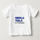 Nikola Tesla é minha super-heroína. Texto gráfico em preto e azul com relâmpago branco.
