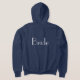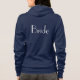 O capuz de zip frontal brilhante é mostrado em azul-marinho com um impressão de texto Bride na cor branca nos lados frontal e traseiro. Personalize este item ou comprar como está.