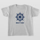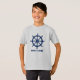Camiseta de meninos com o nome do barco personalizado, o seu nome ou outro texto desejado com uma roda náutica personalizada - leme em azul marinho na cinza.