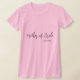 A camiseta feminina é mostrada em um estilo de manga e pescoço de equipe, em rosa com texto preto: Mãe de Noiva e um nome de amostra personalizado. Personalize este item e altere o nome do exemplo para o seu ou comprar como está.