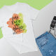 Uma t-shirt com a citação, All Day é uma Nova Aventura, acompanhada de uma seta de tinta, colocada sobre um fundo de abertura de duas cores de aquarela em tons refrescantes de verde e laranja revigorante cria um pano de fundo vibrante para empoderar.