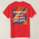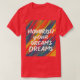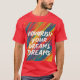 A design de camiseta apresenta um padrão vibrante e abstrato num arco-íris de cores, que lembra um jardim florescente. A frase "Nutricione seus sonhos" é exibida de forma destacada em um roteiro manuscrito ousado, simbolizando o ato de alimentar a aspiração de alguém. A combinação de padrões coloridos e a alta tipografia cria uma composição dinâmica e inspiradora.