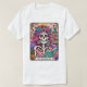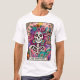 Design vibrante e colorido com um cartão de tarô engraçado com um esqueleto feminino. O esqueleto tem cabelos cor-de-rosa silvestres com flores, uma face de crânio de açúcar, e está segurando um livro aberto. O texto colorido diz: "O worm". Esse design está disponível em uma grande variedade de produtos.