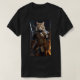 A camiseta "Gato de Combate" apresenta um felino poderoso e ágil, simbolizando força e resiliência. O gato é representado numa pose de ação, com olhos intensos brilhando com determinação. A sua construção muscular e elegante é complementada por equipamento de combate, como luvas e uma fita de cabeça, incorporando o espírito de um guerreiro destemido. O fundo incorpora elementos dinâmicos como linhas de movimento ou padrões brilhantes para um olhar ousado e moderno. O título "Gato de Combatente" é exibido em tipografia futurista e em negrito, com sotaques vibrantes como vermelho, branco ou neon para criar o contraste contra o tecido preto. O design inclui uma etiqueta na moda final, "End Detail", para adicionar um toque profissional.