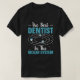 Um design lúdico e peculiar que apresenta um personagem de desenho animado vestindo um casaco dentista e segurando um espelho e uma furadeira, cercada por planetas e estrelas.
