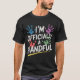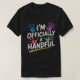 Esta t-shirt preta apresenta o texto branco lúdico "SOU OFICIALMENTE UMA MANEIRA" com impressões digitais coloridas em azul, rosa, vermelho e verde ao redor das palavras. Uma linha amarela enfatiza "A HANDFUL", enfatizando a mensagem humorística sobre ser enérgico ou malicioso.