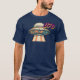 O design de camiseta para "OVNI" apresenta uma ilustração futurista elegante de um disco voador clássico pairando sobre uma misteriosa paisagem iluminada por estrelas. O OVNI é descrito com detalhes intrincados, incluindo luzes brilhantes e uma tela metálica, acrescentando seu apelo no outro mundo. O fundo é um pano de fundo escuro e cósmico com estrelas e planetas distantes, criando um senso de maravilha e intrigas. O design geral é minimalista e impactante, capturando a imaginação e evocando o mistério da vida extraterrestre.