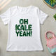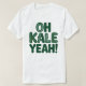 Esta imagem apresenta uma t-shirt branca com o texto "OH KALE YEAH!" impresso em negrito, em caracteres verdes. As letras estão estilizadas com texturas folhosas, parecendo couve. O "O" no topo é maior e tem um padrão de folheto mais complicado.