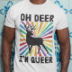 Mostre ao mundo que você é um orgulhoso membro da comunidade LGBTQ com esta camiseta de conscientização de orgulho gay com uma silhueta de veados com a palavra divertida "Oh Deer I'm Queer" em fontes pretas sobre um fundo arco-íris. Esta camisa faz o presente perfeito para qualquer apoiante LGBT no mês do orgulho e todos os dias.