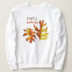 O outono deixa uma camisola com uma ilustração a tinta e a aquarela, com duas folhas de carvalho amarelo acastanhado e o texto Hello Autumn. Uma das folhas tem um lado enrolado que se parece com uma mão que dá ao parceiro dançante.