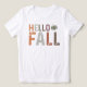 Este design do outono dá as boas-vindas à estação do outono com a frase "Olá outono". As palavras são dispostas em um layout simples, mas visualmente atraente, com "Olá" colocado acima de "Queda". Cada letra da frase é apresentada em uma fonte arrojada, achatada com uma textura levemente amaldiçoada, dando a ela um olhar rústico e metido que complementa o tema do outono.