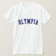 Verifique para fora este t-shirt da Olympia! É você da Olympia, Washington? Você tem um amigo ou um membro da família que amem a Olympia, Washington? Em caso afirmativo, este t-shirt da "bandeira" é exatamente o presente que você está procurando! As características de design "Olympia" na rotulação arqueada do marinho na pia batismal clássica da faculdade.