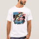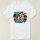Esta camiseta branca apresenta uma ilustração dinâmica de um grande baixo de boca saltando da água, colocado contra um fundo de bandeira americana aflita com árvores abafadas e sotaques florais coloridos. É uma maneira excelente de mostrar seu amor pela pesca e pelos EUA.