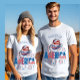 Uma camiseta personalizada para toda a família para a comemoração de 4 de julho. O padrão tem a AMÉRICA em estrelas e listras com vermelho, branco e azul. O reverso tem o mesmo padrão. O TEXTO 'Orgulhoso de' pode ser personalizado.