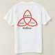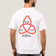 Na frente: Símbolos pagãos das três fases da lua, os ouroboros, e um triquetra em fundo preto com a legenda "PROUD TO BE A HEATHEN". No verso: um triquetra com partes marcadas como empregada, mulher, e crona com "deusa" embaixo.