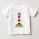 Os miúdos náuticos vestem desenhos animados listrados | do farol. Terra Ahoy! Ideia bonito do presente do tema da praia para o menino ou a menina. Ilustração litoral colorida da cena com os pássaros vermelhos e brancos da torre e de mar da casa clara do porto. Desenho de Personalizable com nome ou lugar.