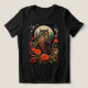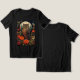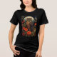 T-shirt with a cool looking owl with a piercing stare. A full moon in the back with a garden of red flowers.