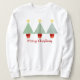 Padrão moderno, doce de Natal feliz. Apresenta três árvores de Natal - uma é verde com pontos brancos, uma é verde e branca, e uma é verde em cheques brancos. Cada uma é revestida com uma estrela brilhante e em potes de argila com arco de fita vermelha. Design minimalista, Feliz Natal está na tipografia da escrita. Palavras de Feliz Natal podem ser personalizadas.