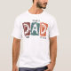 Esta camiseta branca apresenta a palavra "PAI" em letras grandes e estilizadas em bloco, com textura angustiada e variados tons de marrom, lacre e laranja. Acima de "PAI" está o texto "O MITO", e abaixo estão "O HOMEM" à esquerda e "A LEGENDA" à direita, tudo em uma fonte simples e menor. A design celebra a paternidade com um tema ousado e lendário.