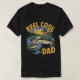 Esta camiseta preta apresenta as palavras "REEL LEGAL" em uma fonte em negrito, amarela, ligeiramente curvada no topo. Abaixo, uma ilustração em estilo cartoon mostra um pai e um filho pescando, sorrindo e segurando peixe. Na parte inferior, a palavra "PAI" é escrita em uma fonte maior, amarela. O fundo mostra uma cena do lago com um pôr do sol. Esta camisa celebra o vínculo entre pai e filho e seu amor comum pela pesca.