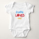 Pai me ama T-shirts, camisetas compridas de manga, camisas de suor, capuzes de pulôver, chapéus, camisas de roflo, vestidos sem manga, T-shirts raglan, fatos de futebol, fatos de corpo orgânicos e outros roupas para bebês com texto vermelho, azul e ouro com um coração que lê Pai me ama!