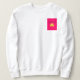 Meu design apresenta um fundo rosa vibrante com texto em uma mistura de rosa e preto, complementado por bordas brancas. Três corações de ouro na parte inferior são conectados por cordas finas de ouro, adicionando um toque de elegância à composição geral.