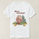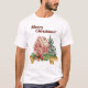 Uma t-shirt festiva para vestir para as próximas férias com um design de aquarela de uma casa de pão-de-gengibre enfiada numa tosse de vergreens com bagas vermelhas e um arco vermelho.