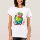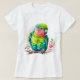 T-shirt com uma bela ilustração de papagaio. Um pequeno papagaio verde com cores azuis e amarelas se misturando. O pescoço tem um tom vibrante de rosa avermelhado.