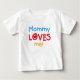 A mamãe ama-me T-shirts, camisetas de manga comprida, fatos-macaco, fatos orgânicos, vestidos sem manga, camisas de rebuliço, chapéus, T-shirts raglan e outros roupas para bebês com texto azul, vermelho e dourado e design cardíaca que lê Mamães me ama!