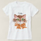 Camiseta para uma mulher com o rosto de um rosto pintado de aquarela de um gato bonito com olhos verdes, vestindo um arco laranja. O nome no Tee pode ser alterado. Obrigados para a Creative Fabrica para alguns dos elementos na design.